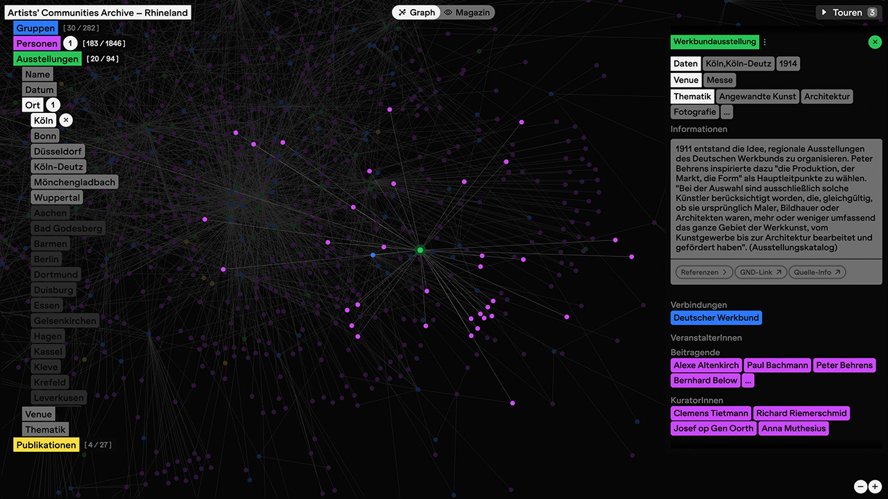 Wie haben sich die Künstlerkolonien im Rheinland im 20. Jahrhundert entwickelt? Welche Künstler*innen waren für einander wichtig und welche Orte waren kreative Knotenpunkte? Zu diesen Fragen forscht das Projekt Artists' Communities Archive – Rhineland" des Zentrum für Rheinlandforschung der philosophischen Fakultät der HHU.Gemeinsam mit dem Kölner Studio Serve&Volley und den Entwicklern von Undefined ist eine Website entstanden, die die Verbindungen visualisiert und explorative Forschung ermöglicht. Ich habe die Entwicklung begleitet und war für die Datenbereinigung und Automation zuständig.